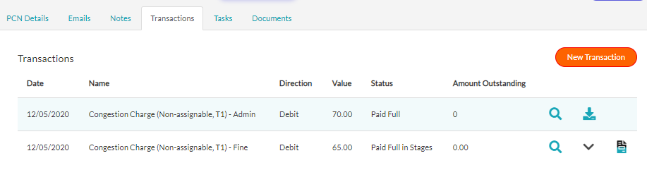 You can access the invoices for these fee's via the transactions tab or the documents tab. If you need to arrange a credit for a refund or want to show a partially paid fee for an unpaid PCN then you can do this via the New Transaction