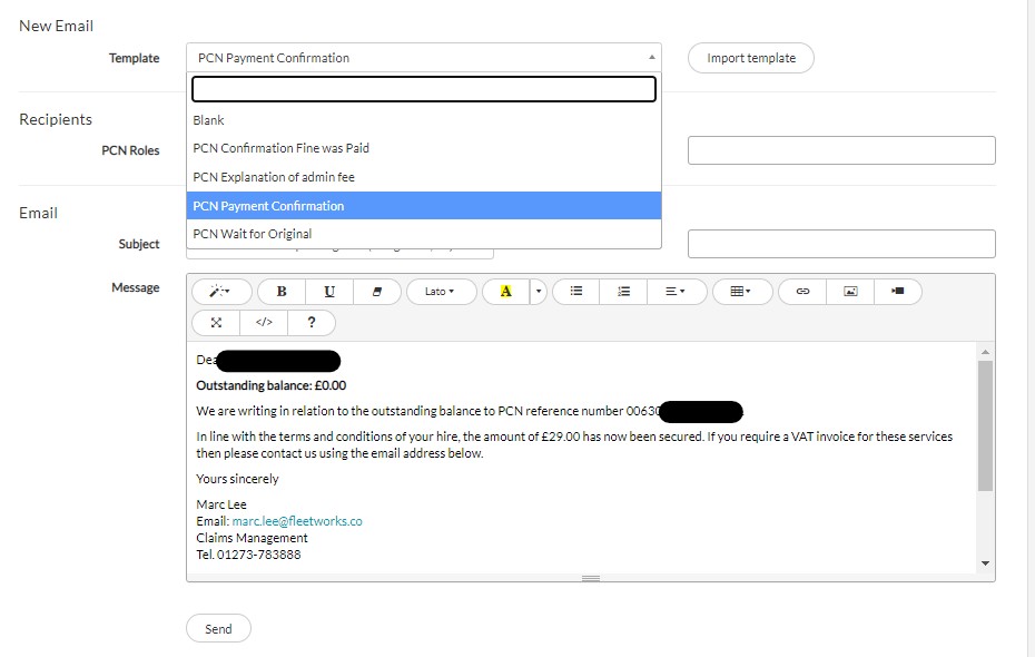 You can also notify a client about the amount paid for a PCN. Go into the Email tab and select the PCN Payment Confirmation template and click Import. In the PCN Roles field select the customer email, then personalise the email as required and press send. You can attach any documents that you have added or created (such as a VAT invoice which is created automatically) by selecting them in the Attachments field.